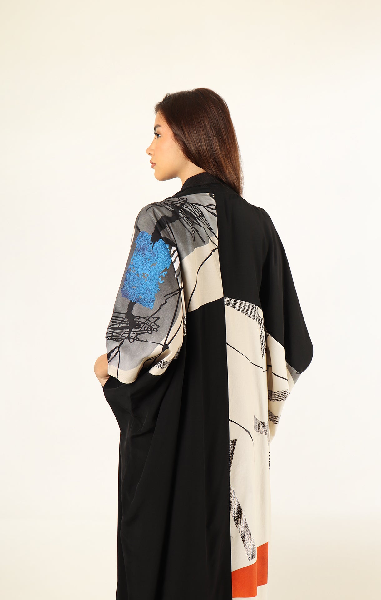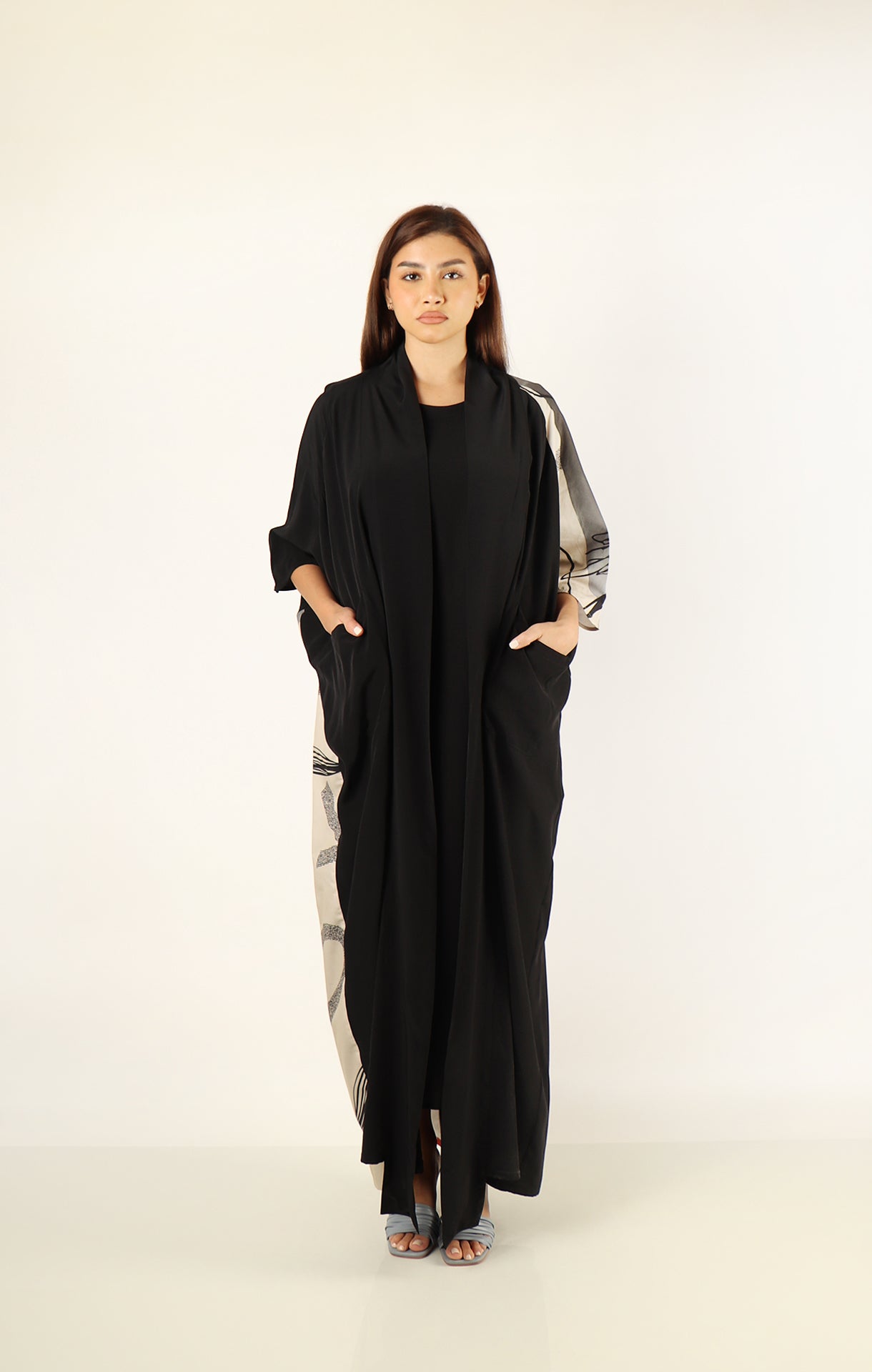A sleek black satin abaya with a stylish cotton pattern at the back for a modern touch.