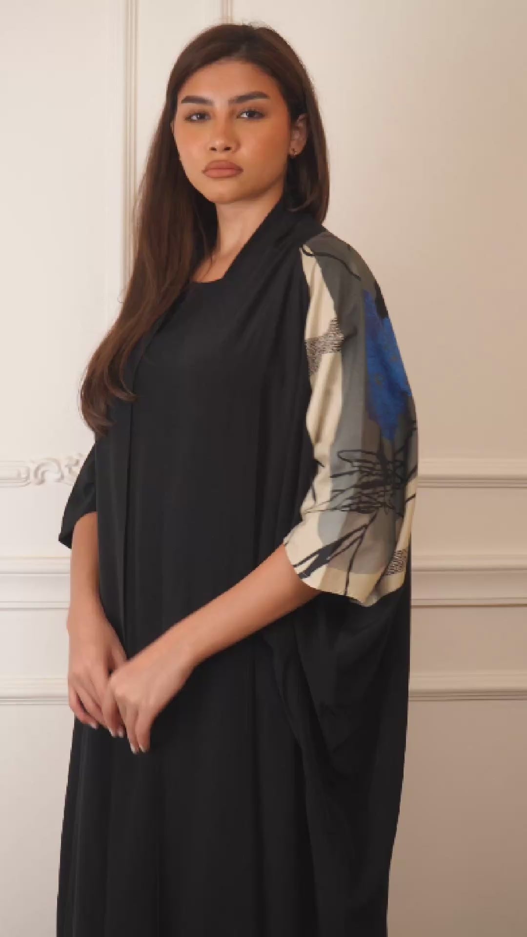 .عباية سوداء أنيقة من القطن ستان مع نقشة قطنية في الخلف لإضافة لمسة عصرية