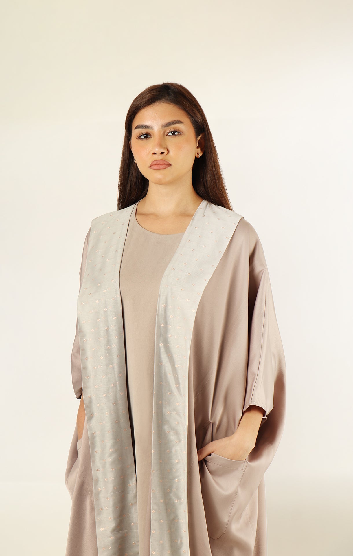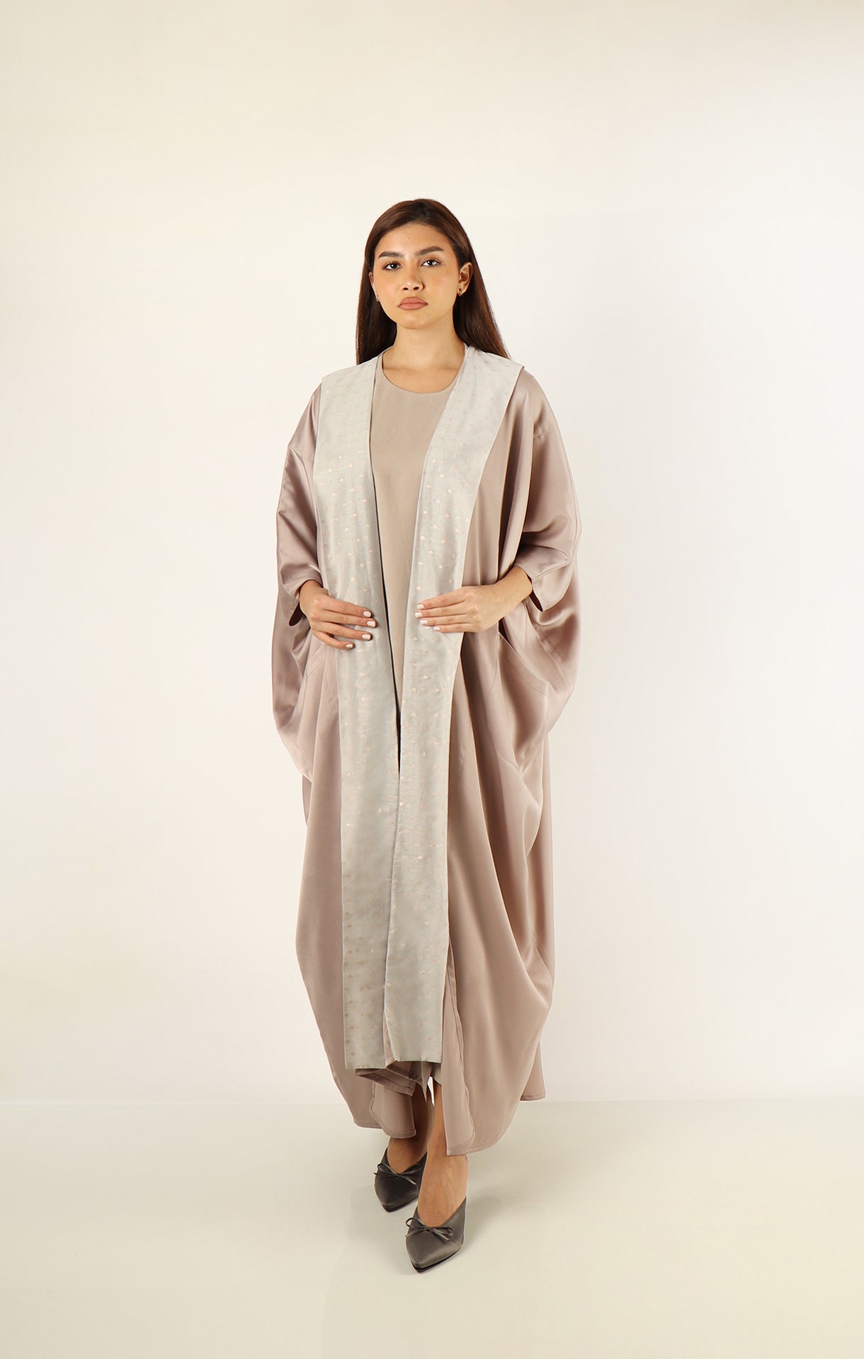 A sophisticated Champagne Pink abaya featuring crepe satin and jacquard fabric at the front for a smooth, elegant look.