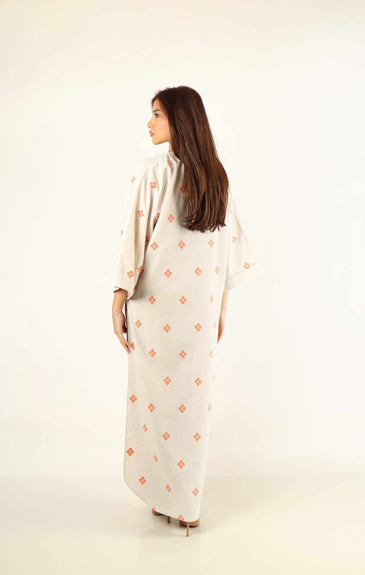 كارديغان بيج بنقشات برتقالية مع جمبسوت بلون البرتقالي من قماش الرايون. مثالي للأناقة والراحة في كل المناسبات.