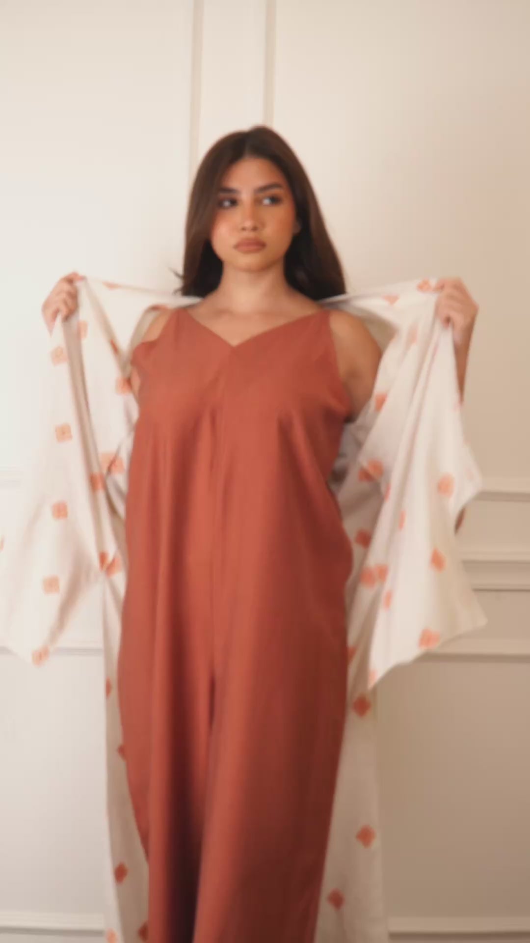 An elegant beige outerwear  with orange patterns is paired with a burnt- orange colour jumpsuit made from premium rayon fabric. Perfect for effortless style and comfort in any setting.